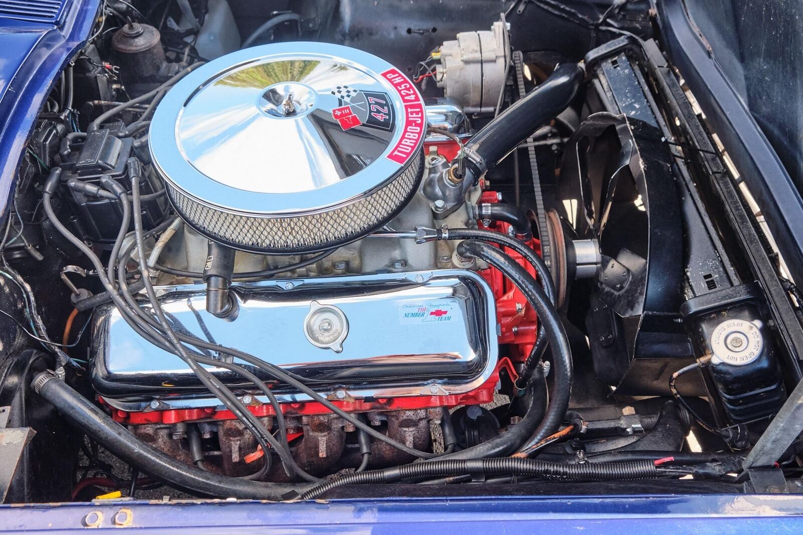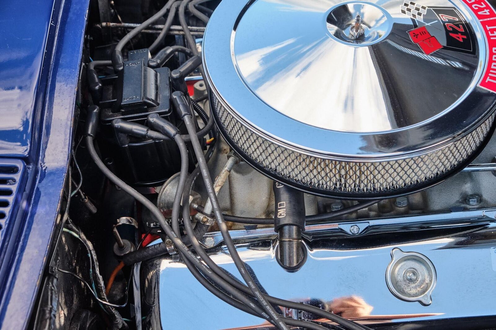 - 425 Corvette-flagged chrome air cleaner cover