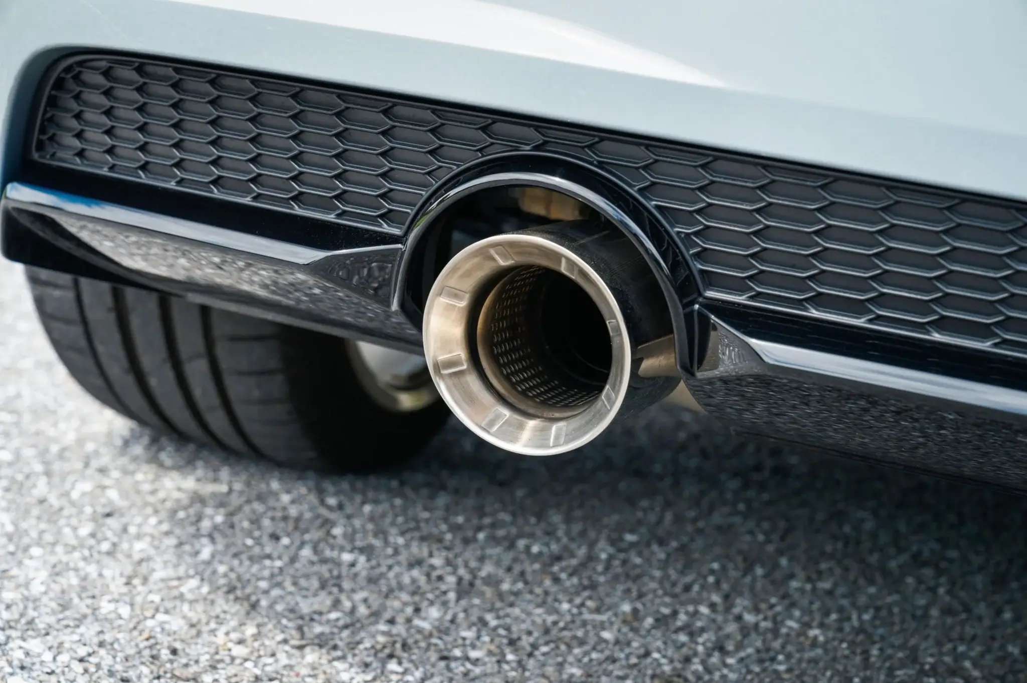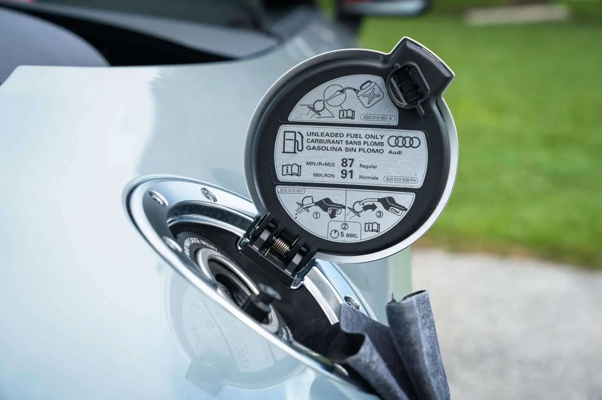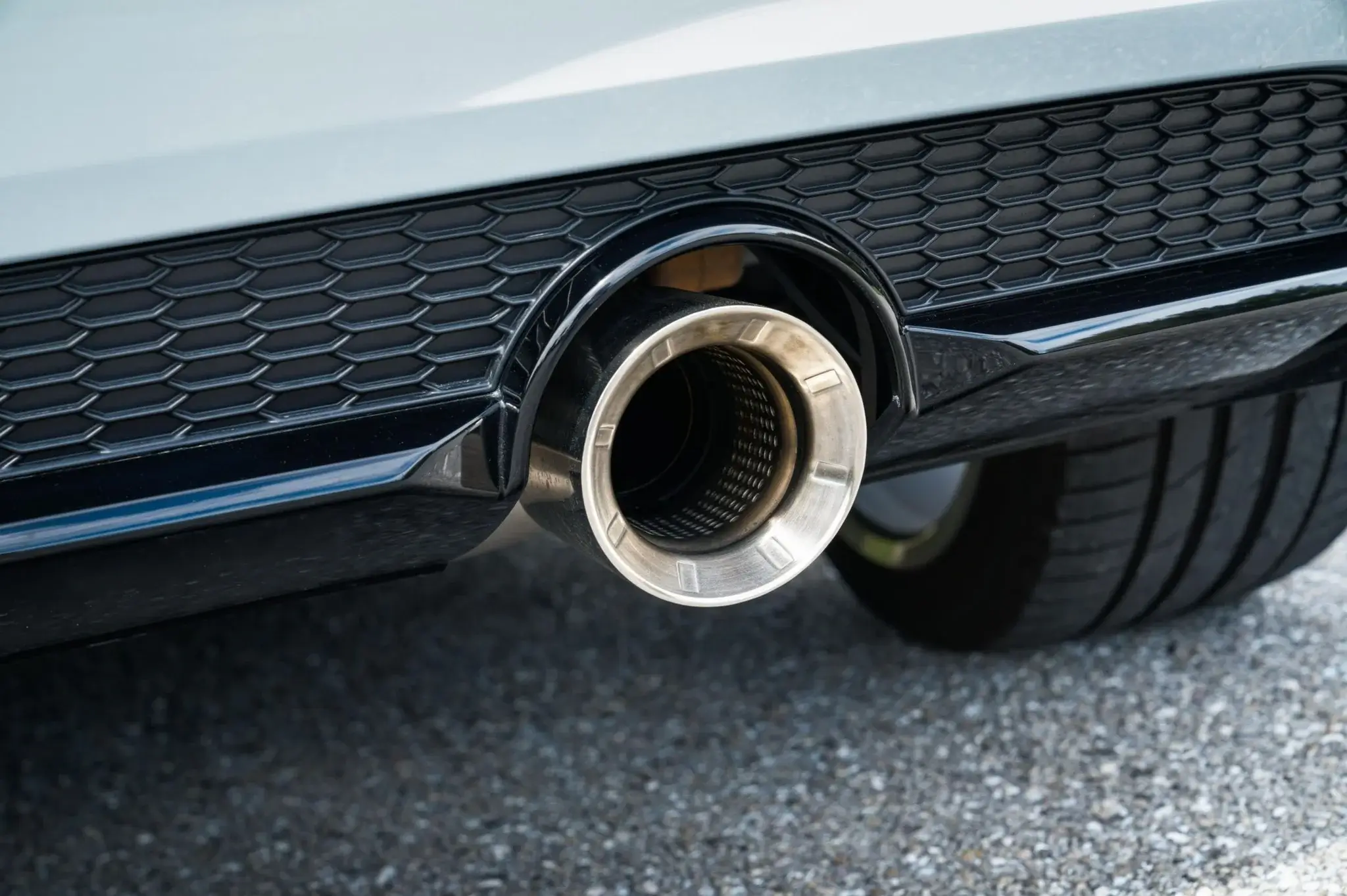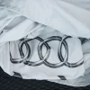 - High-gloss black exterior trim and matte gray Audi rings ahead of the rear wheels