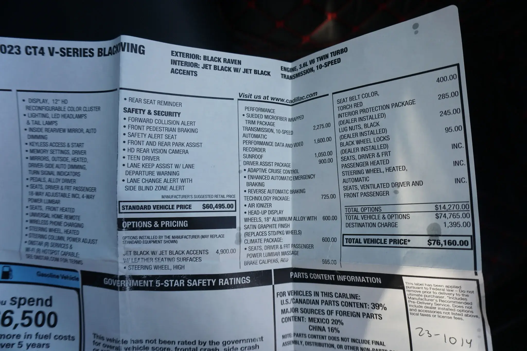 Introduced as the most powerful Cadillac ever in its class, the CT4-V Blackwing boasts a 472-horsepower twin-turbocharged V6 engine, aerodynamic exterior elements, Magnetic Ride Control adaptive suspension, and Brembo high-performance brakes. This 2023 example is finished in Black Raven over a Jet Black interior and features an optional 10-speed automatic transmission, a performance data & video recorder, a sunroof, Technology Package, Driver Assist Package, Climate Package, red brake calipers, and Satin Graphite-painted wheels.
